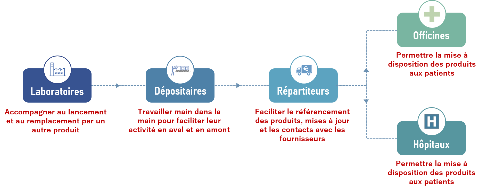 Le bon référencement des produits chez les dépositaires et les grossistes-répartiteurs est l’étape importante où toutes les informations produits (commerciales, règlementaires et logistiques) doivent être transmises et conformes aux cahiers des charges de vos partenaires pour une mise à disposition dans les officines, les établissements de santé et aux patients le plus rapidement possible.